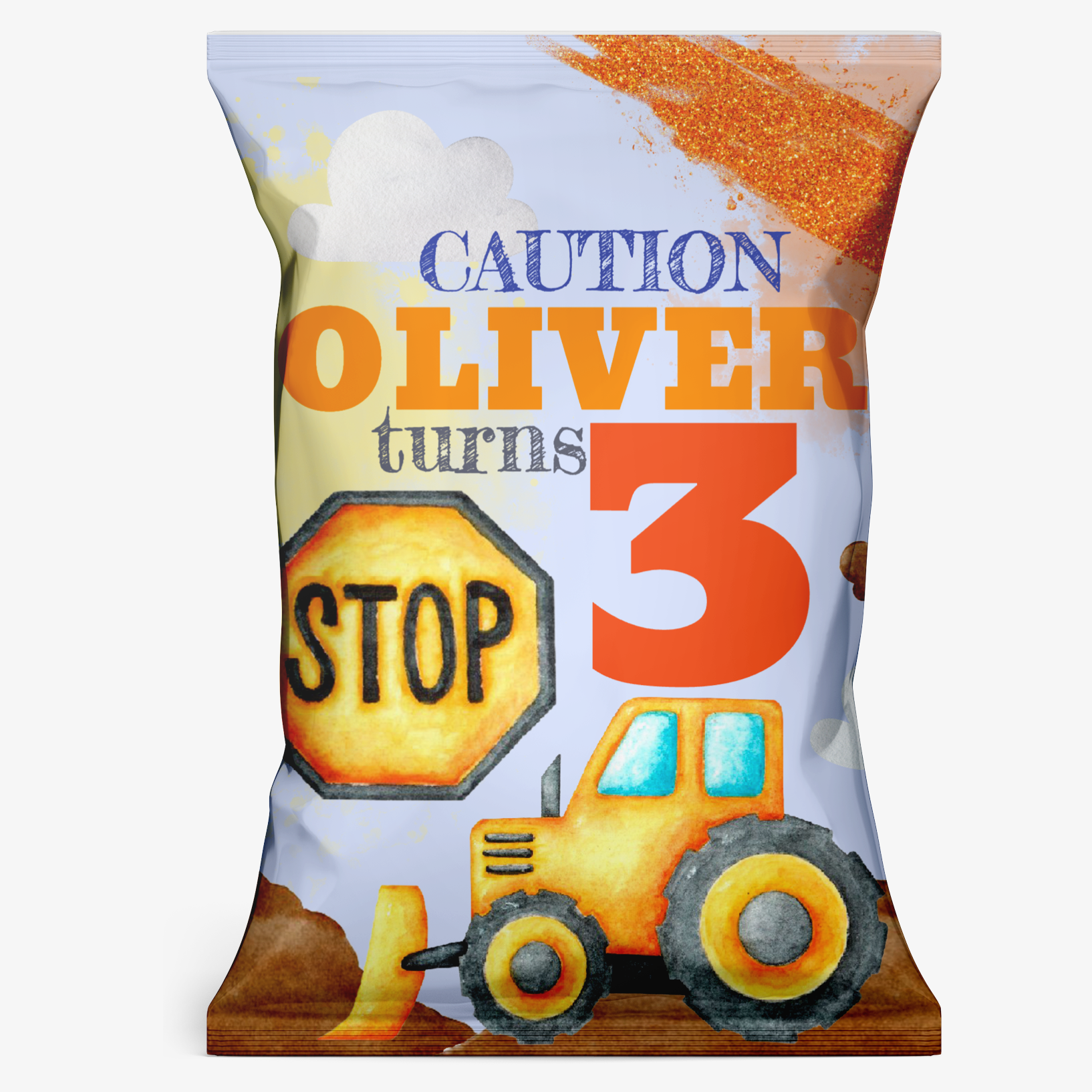 Personalised Digger themed party chip bag. Fun theme crisp packets. Perfect favour for your guests.