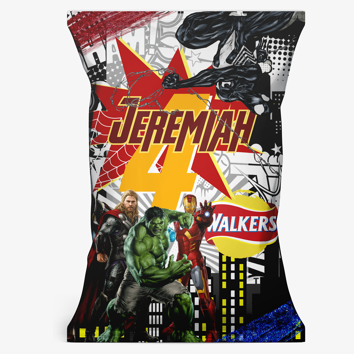 Personalised crisp / chip bag perfect for a fun super hero theme chip bag. A custom addition to the birthday boys party. A favour their friends can enjoy!